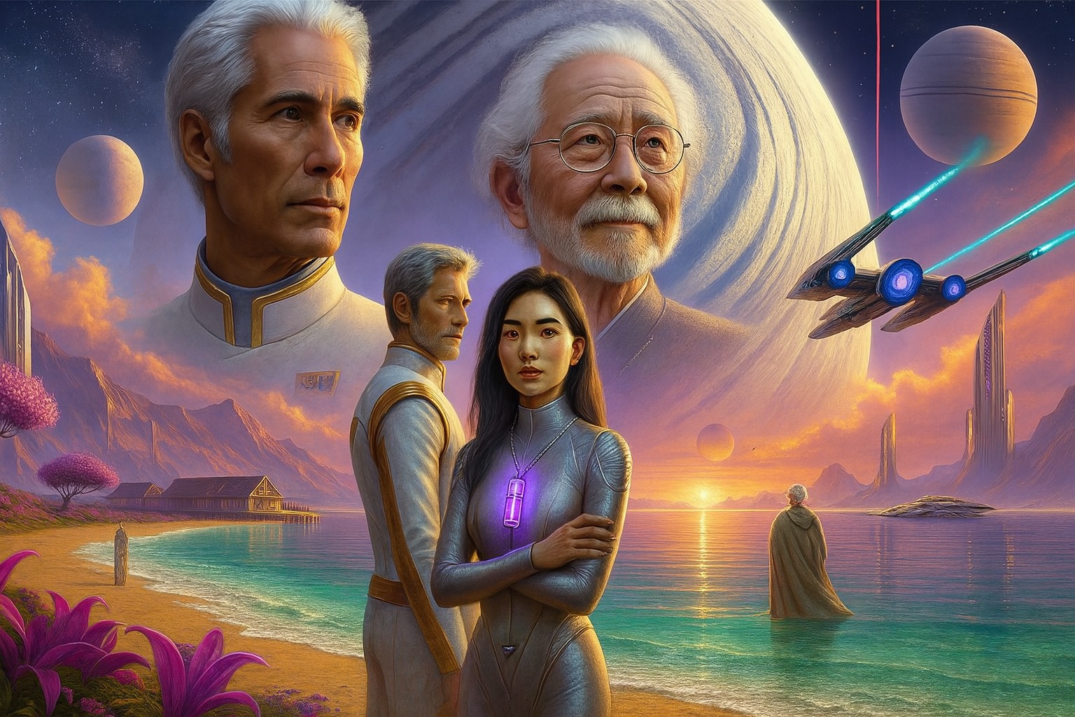 ベイタ・ダレルは、その足元に広がる惑星「ヘイヴン」の異様な美しさに見とれていた。空は白とピンクの色合いで彩られ、目の前には静謐なクリスタルのように澄んだ海が広がっている。その夢のような光景は、銀河の他のどこでも見たことのないものだった。しかし、彼女がここに来た理由は景色を楽しむためではない。彼女は第二ファウンデーション、いや、もしかするとそれ以上の秘密を背負っていた。