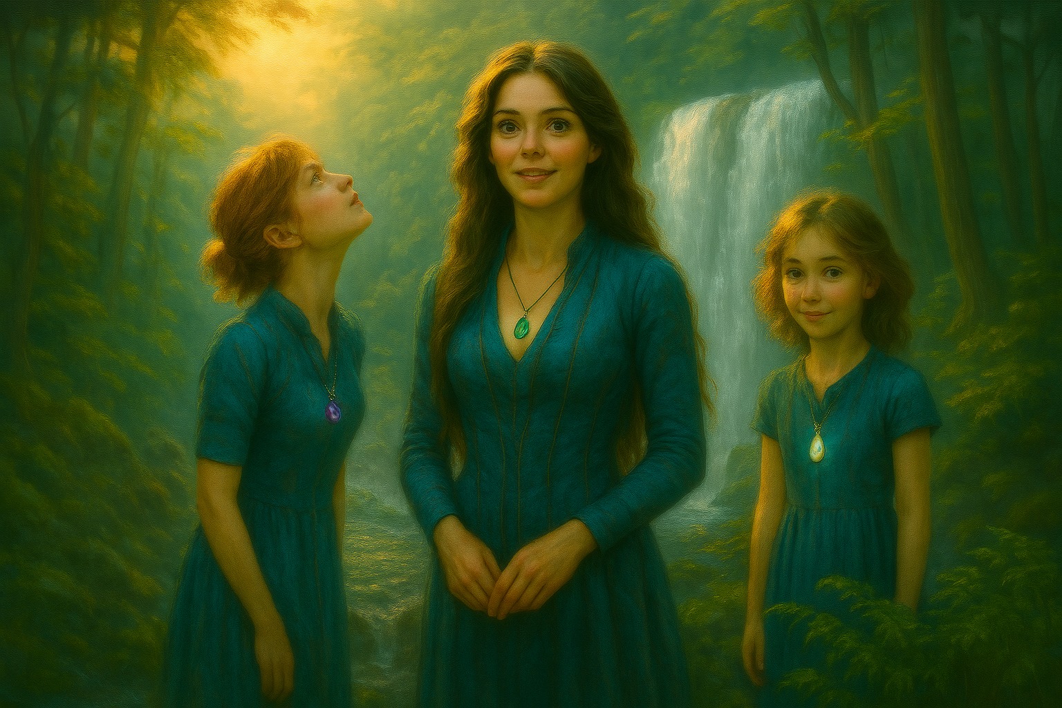 森の奥、朝の光に包まれた滝のほとりに、三人の少女が立っていた。水飛沫がきらめき、彼女たちの胸元のペンダントが淡く光を返す。